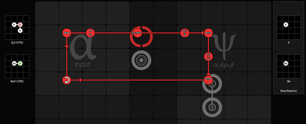 Still not enough? The water and chlorine sorter needs to maintain a 1:1 output ratio of hydrogen and sodium so the output targets fill up at the same rate. It can do this by not outputting the hydrogen directly but building an H2 molecule out of it. When the H2 is complete, it can be broken in half like the other inputs.